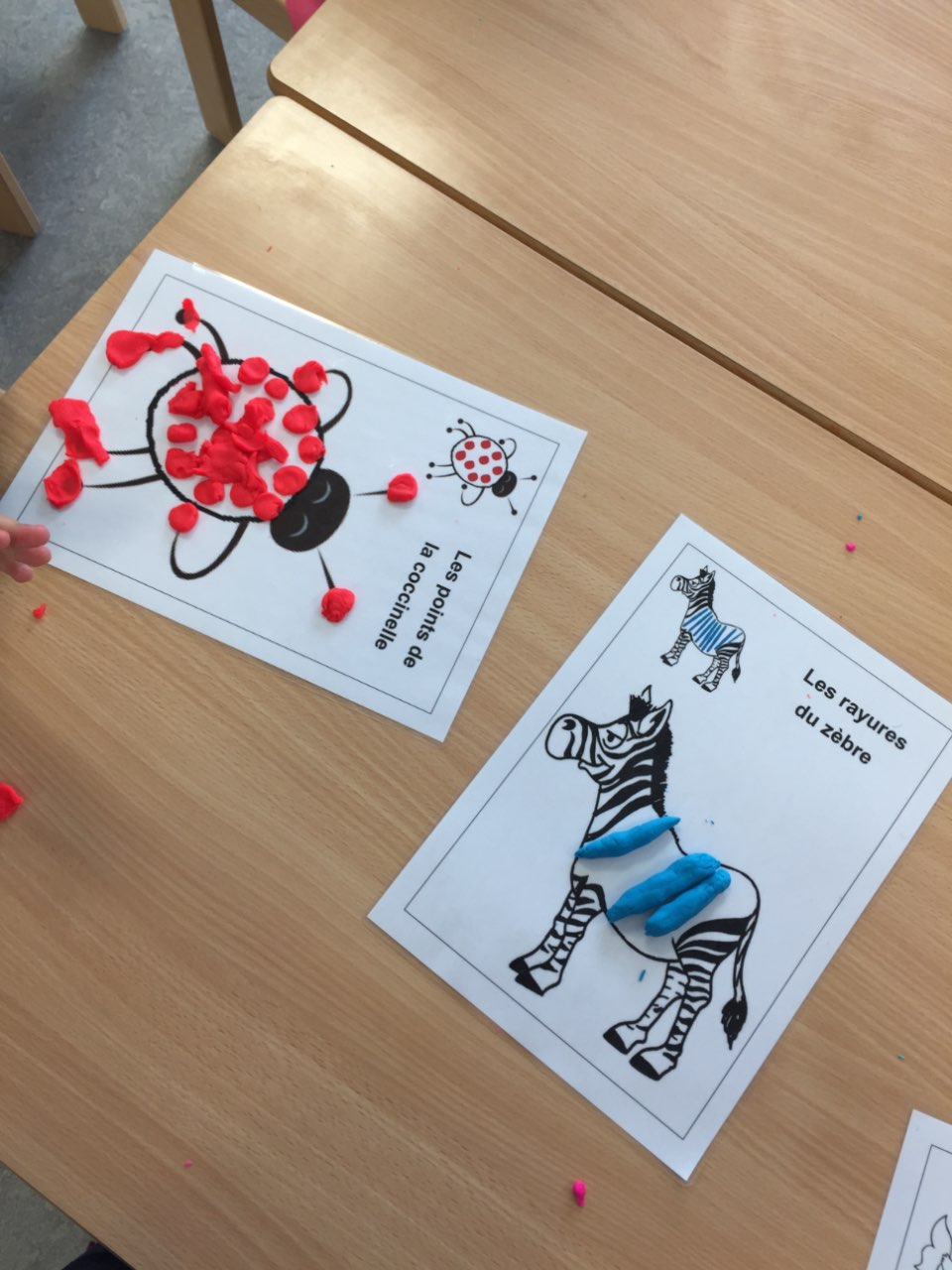 | Objectifs (voir p.ex. cadre de référence) | Aujourd’hui nous avons choisi de travailler, à l’aide de la pâte à modeler, des notions visuelles / d’observations / de reproduction ...